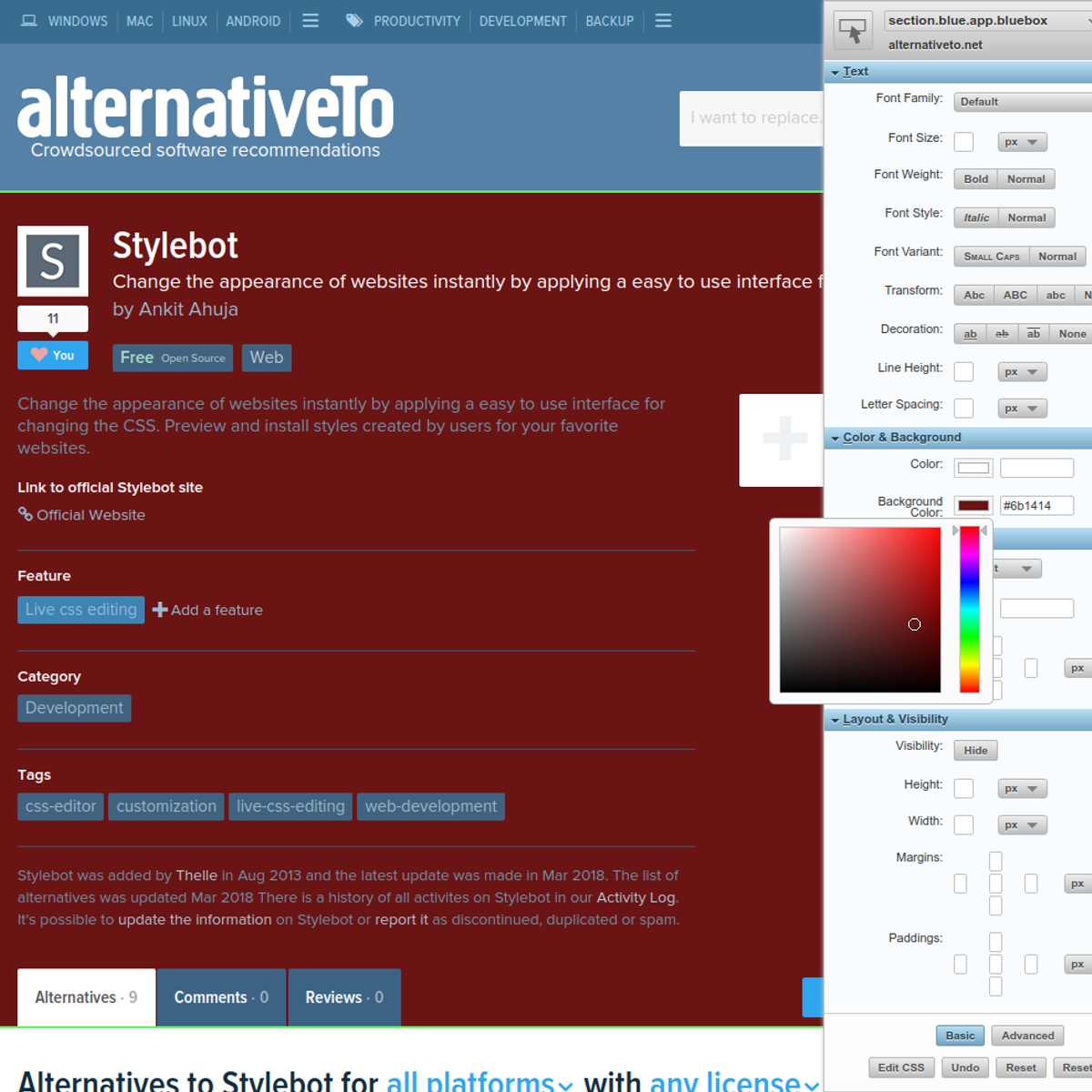 Pick and style elements like in Firebug. Alternatives to Stylebot for Chrome, Web, Firefox, Windows, Mac and more. And if you have a Twitter account, feel free to tweet at me (@dk_the_human) with any other pieces of feedback you have.